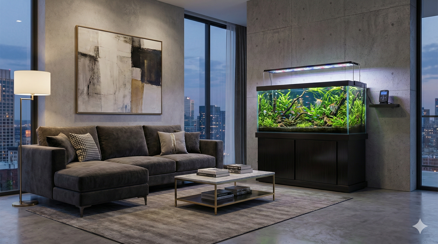 - Эстетика: аквариум становится центром комнаты и выглядит аккуратно днём и вечером.