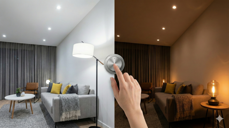 Поворотный диммер хорош для гостиной и коридора. Сенсорный — для спальни и кухни с чистыми панелями. Дистанционный и умный диммер — для создания сложных сцен и интеграции с умным домом.