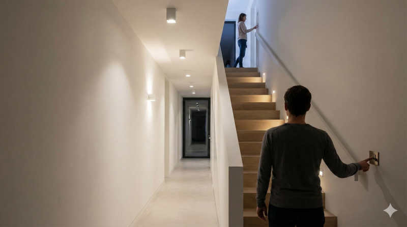 - Лестницы: включение с верхнего и нижнего этажей снижает риск падений в тёмное время суток.