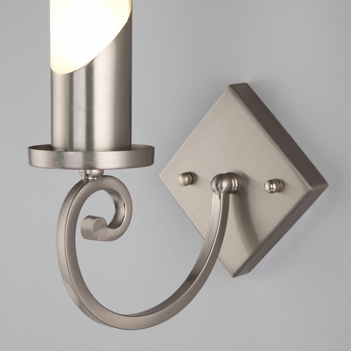 Корпус выполнен в благородном никеле, устойчивом к износу, что обеспечивает долгий срок службы и аккуратный вид. Компактные размеры и сдержанная форма позволяют легко вписать бра в прихожую, спальню, гостиную или над зеркалом в ванной комнате (с учётом требований к степени защиты).