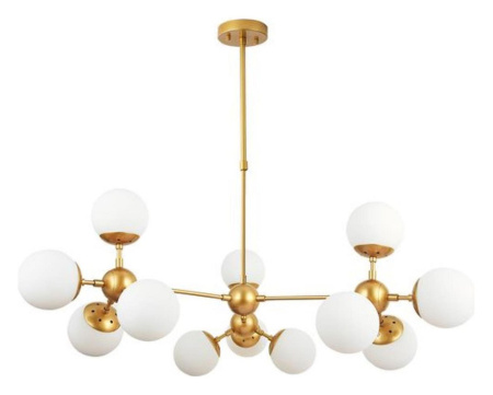 Люстра выполнена в изысканном золотом цвете, который добавляет тепла и уюта, а также гармонично сочетается с любыми цветовыми решениями. Широкий световой поток, создаваемый 12 лампами, наполняет пространство мягким и комфортным освещением, что делает её идеальной не только для гостиных, но и для кухонь, офисов и ресторанов.