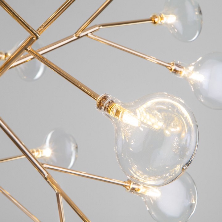 Люстра выполнена с использованием современных технологий и материалов, что обеспечивает надежность и долговечность. Легкая конструкция из высококачественного металла дополнена изысканными элементами, которые эффектно рассеивают свет, наполняя пространство мягким и приятным блеском.