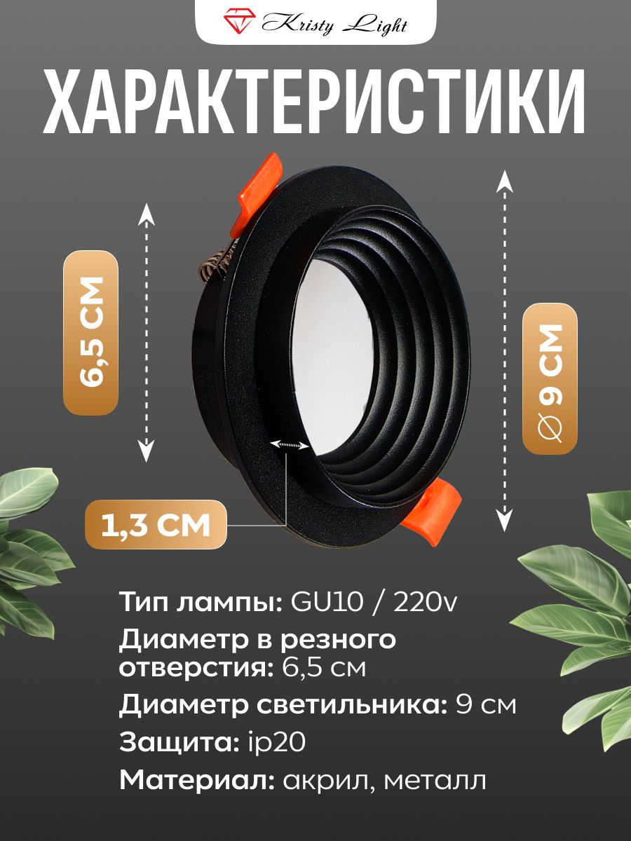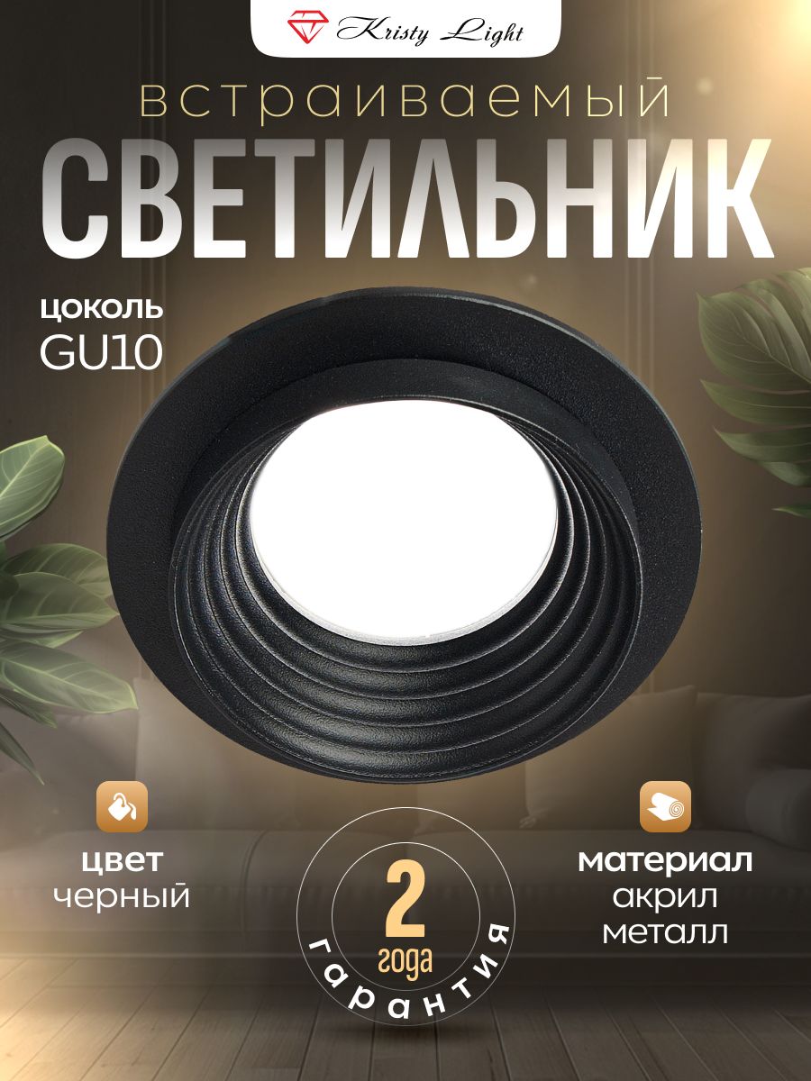 Светильник Kristy Light KL0107B встраиваемый точечный, цвет черный, круглый, под сменную лампу GU10. Встраиваемый светильник подходит для натяжного потолка и потолка из ГЛК. Корпус из алюминия черного цвета. Максимальная мощность лампы до 15Вт. Светильник подойдет как для квартир, так и для офисов, баров, ресторанов, загородных домов, отелей. Крепление лампы скрытое, обеспечивается двумя металлическими полосками-пружинами, находящимися во внутренней стороне светильника.